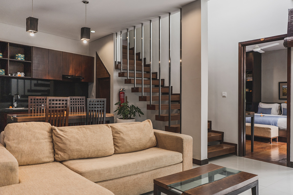 Memiliki interior wooden minimalist dengan dekorasi-dekorasi berwarna biru muda, memberikan suasana tenang bagi keluarga yang ingin menikmati liburan di Bali. Setiap unit villa dilengkapi dengan dapur, ruang makan indoor, serta ruang tamu yang bisa difungsikan sebagai tempat bermain anak maupun tempat bersantai.