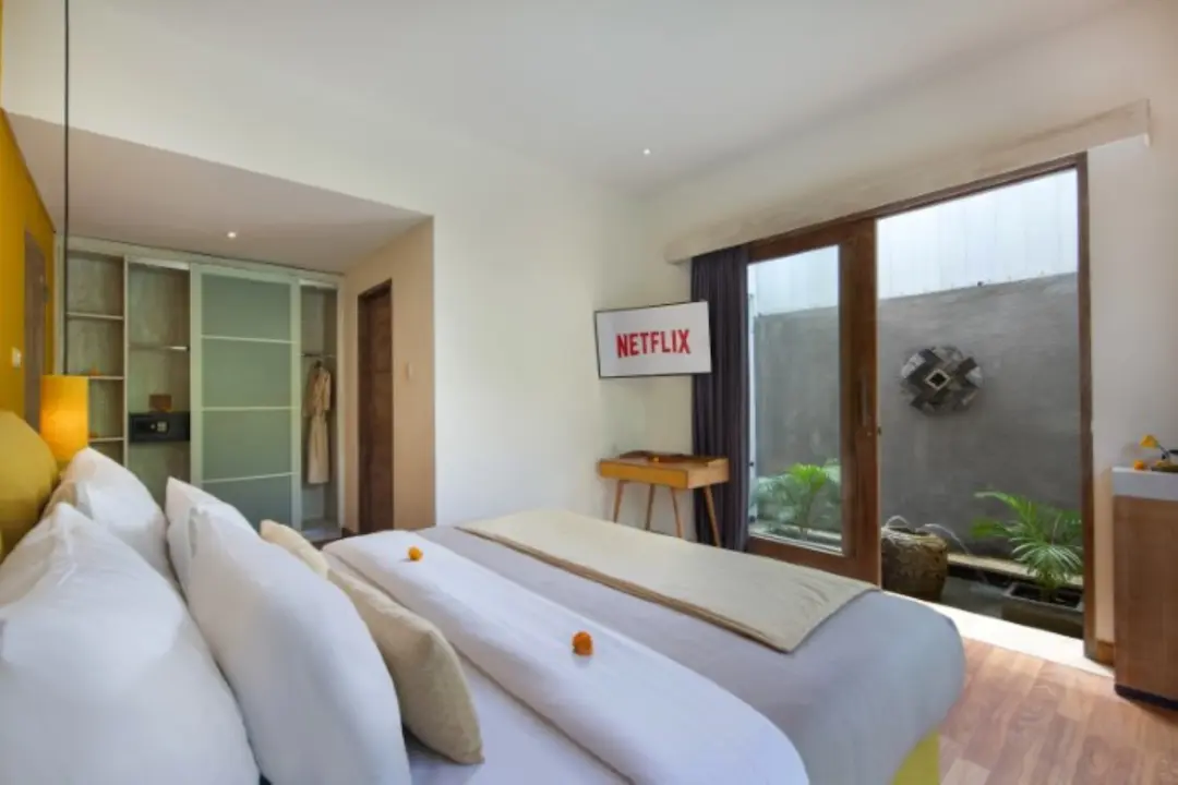 Rest and recharge on a spacious king-size bed with premium linens and plush pillows, ensuring a peaceful and luxurious night’s sleep.